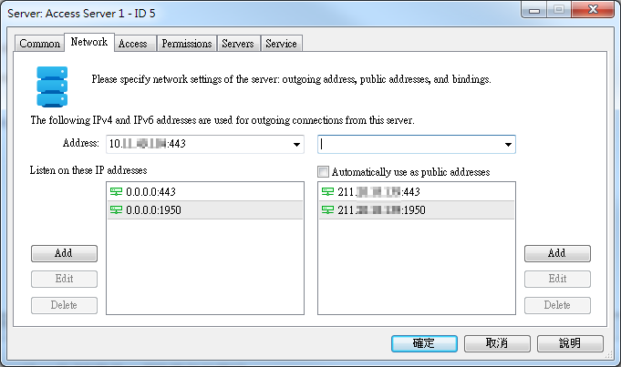 第一步、將 Main Server 網路設定的 Automatically use as public addresses 打勾取消,並將內網 IP 修改成外網 IP 。